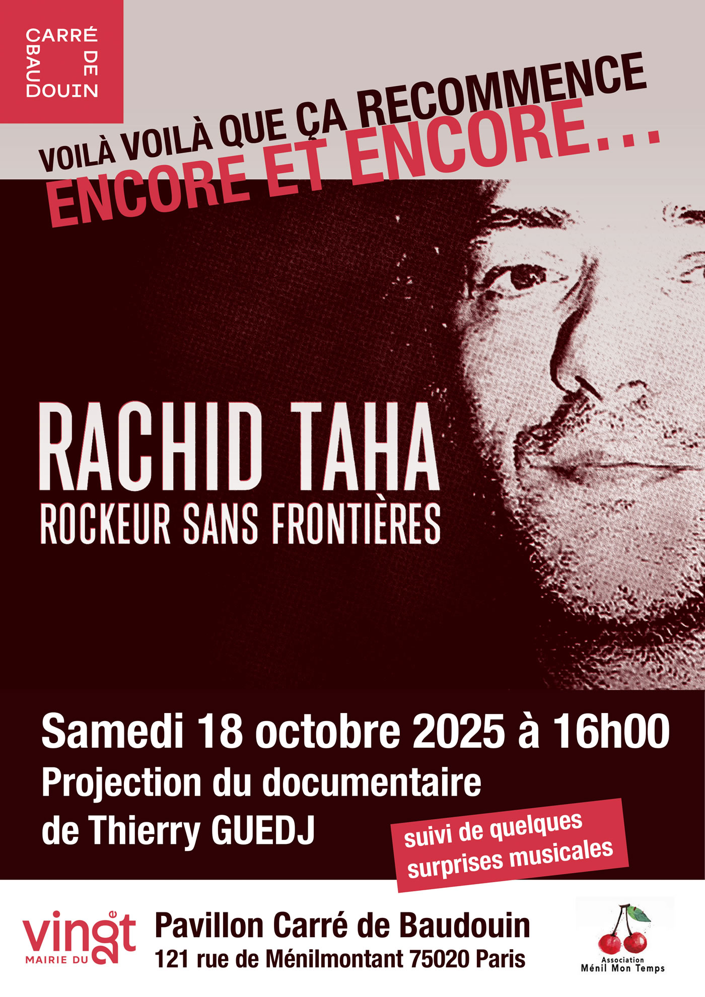 Christian Olivier, Jil Caplan, Allain Leprest, Rachid Taha, Claire Elzière, Dominique Cravic, Sanseverino, Miossec, Jeanne Added, Cyril Mokaiesh, Hakim Hamadouche, l'armée mexicaine, Sarah Olivier, Leos Carrax, Denis Lavant, Jean-Pierre Mocky, Jean-Michel Ribes, John Greaves, Stag, Hervé Legeay, Dominique Grange, Patrick Abrial, Jye, Ticha Lapointe, Petit Louis, Sabine Drabowitch, Les Frérots, Christian Paccoud, Les sœurs Sisters, Armelle Dumoulin, Aïcha Touré, le groupe Bernard, l'Étrangère, Jerome Savy, Serge Guérin, Sidi Bémol, Johnny Montreuil, Gino et Guigui, Nawel Ben Kraïem, Luis Régo, Barbee & Alice Botté (Berline), Mohammed Fellag, Naima Yahi, Vox Populo (Thierry Poutrain et Cyril Dillard), Yan Péchin, Lise Cabaret, K’Roll Vengeance et les Apparitions, Tyard, Thomas Ménil, David Lafore, Patrick Eudeline, Éric Sauviat, Raymond Doumbé, Les Triplettes de Ménilmontant, Nesrine et Fayçal du groupe IWA, Slimane Dazi, Akli Dehlis, Mirabelle Gilis, Christine Roch, Edith Begout, Claire Adrados, Guy Roch, Cyril Adda, Justine Jérémie, Nour, Camille Feist, Pauline Paris, Marie La Mesta, Mustapha Boutadjine, Sarah Jeanne Ziegler, El Gafla, Lucile Blanc, Rouge Gorge, Automne et Perry, Hervé Lechâble, Paul Péchenart, Tarzan & Eve - Nina Morato et Stephane - Fergus - Dorey, Râlouex, Eric Tafani, François Staal, Raphaël Dausse, Jeanne Rochette, Jeph, Arsène Perbost, Parhal, Paul Cash, Nicolas Magat dit Laoutec, Balthaze, Blanche DLT, Nous Deux, Claudio Zaretti, Elnour Zidour, Jami Rose, Jean-Paul Miotto - Latiniasse, Thibault Abrial, Le Grand Orchestre de Ménilmontant, Benoit Hamelin, Warzim boule de feu, Enzo, Marie Pétrolette, Da Capo, Claude Astier, B-Roy, Ritier, Fleur Offwood and the Conifers, Reno Simo, Jack Belghit, Florent L’Hériteau, Carole Masseport, Philippe Guillard, Mehdi Kabar, Béral, Riki De la Butte, Sagittarius A, Nicolas Joseph, Lise Martin, Stidy Jane, Yo Enko, Héloïse Roth, Pauline Drand, Stéphane Zelten, Emmanuel Pribys, Béatrice Angèle, Malika Berrichi, Magou Samb, Delphine Labey, La Bestiole, Alexis Lambert, Jonathan Malnoury, Mymytchell, Caroline Alonzo, Marwen Kammarti, Florent Moenan-Duvivier, Léo De Saint-Germain, Yan Coti, Houria Cheurfa, Marc Bisini, Morin Smole, Mucat et ses musiciens, Thierry Cojan Perso, Noé Reinhardt, le groupe Lafille, Anne-sophie Charron et Jérôme Duhamel, Benjamin Colin, Mathieu Le Sénéchal, Elise Berthelier, Julien Robinson, Les Balochiens, Mahdi del Asnam, La Band’o, Tomislav, Patricia Caille, Mary, Fleur de Berge, Le piano qui chante, Belaid Branis (...)