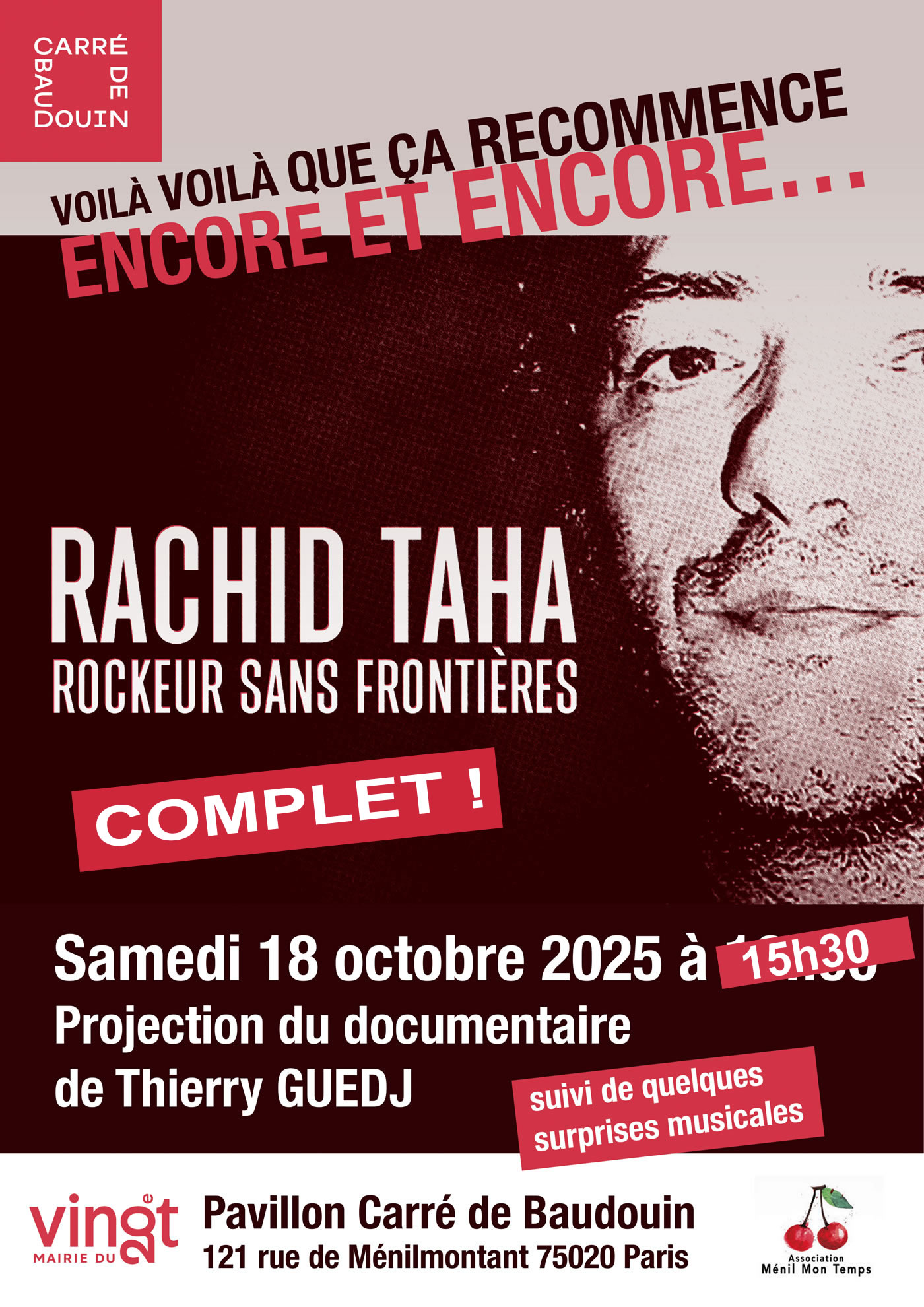 Christian Olivier, Jil Caplan, Allain Leprest, Rachid Taha, Claire Elzière, Dominique Cravic, Sanseverino, Miossec, Jeanne Added, Cyril Mokaiesh, Hakim Hamadouche, l'armée mexicaine, Sarah Olivier, Leos Carrax, Denis Lavant, Jean-Pierre Mocky, Jean-Michel Ribes, John Greaves, Stag, Hervé Legeay, Dominique Grange, Patrick Abrial, Jye, Ticha Lapointe, Petit Louis, Sabine Drabowitch, Les Frérots, Christian Paccoud, Les sœurs Sisters, Armelle Dumoulin, Aïcha Touré, le groupe Bernard, l'Étrangère, Jerome Savy, Serge Guérin, Sidi Bémol, Johnny Montreuil, Gino et Guigui, Nawel Ben Kraïem, Luis Régo, Barbee & Alice Botté (Berline), Mohammed Fellag, Naima Yahi, Vox Populo (Thierry Poutrain et Cyril Dillard), Yan Péchin, Lise Cabaret, K’Roll Vengeance et les Apparitions, Tyard, Thomas Ménil, David Lafore, Patrick Eudeline, Éric Sauviat, Raymond Doumbé, Les Triplettes de Ménilmontant, Nesrine et Fayçal du groupe IWA, Slimane Dazi, Akli Dehlis, Mirabelle Gilis, Christine Roch, Edith Begout, Claire Adrados, Guy Roch, Cyril Adda, Justine Jérémie, Nour, Camille Feist, Pauline Paris, Marie La Mesta, Mustapha Boutadjine, Sarah Jeanne Ziegler, El Gafla, Lucile Blanc, Rouge Gorge, Automne et Perry, Hervé Lechâble, Paul Péchenart, Tarzan & Eve - Nina Morato et Stephane - Fergus - Dorey, Râlouex, Eric Tafani, François Staal, Raphaël Dausse, Jeanne Rochette, Jeph, Arsène Perbost, Parhal, Paul Cash, Nicolas Magat dit Laoutec, Balthaze, Blanche DLT, Nous Deux, Claudio Zaretti, Elnour Zidour, Jami Rose, Jean-Paul Miotto - Latiniasse, Thibault Abrial, Le Grand Orchestre de Ménilmontant, Benoit Hamelin, Warzim boule de feu, Enzo, Marie Pétrolette, Da Capo, Claude Astier, B-Roy, Ritier, Fleur Offwood and the Conifers, Reno Simo, Jack Belghit, Florent L’Hériteau, Carole Masseport, Philippe Guillard, Mehdi Kabar, Béral, Riki De la Butte, Sagittarius A, Nicolas Joseph, Lise Martin, Stidy Jane, Yo Enko, Héloïse Roth, Pauline Drand, Stéphane Zelten, Emmanuel Pribys, Béatrice Angèle, Malika Berrichi, Magou Samb, Delphine Labey, La Bestiole, Alexis Lambert, Jonathan Malnoury, Mymytchell, Caroline Alonzo, Marwen Kammarti, Florent Moenan-Duvivier, Léo De Saint-Germain, Yan Coti, Houria Cheurfa, Marc Bisini, Morin Smole, Mucat et ses musiciens, Thierry Cojan Perso, Noé Reinhardt, le groupe Lafille, Anne-sophie Charron et Jérôme Duhamel, Benjamin Colin, Mathieu Le Sénéchal, Elise Berthelier, Julien Robinson, Les Balochiens, Mahdi del Asnam, La Band’o, Tomislav, Patricia Caille, Mary, Fleur de Berge, Le piano qui chante, Belaid Branis (...)